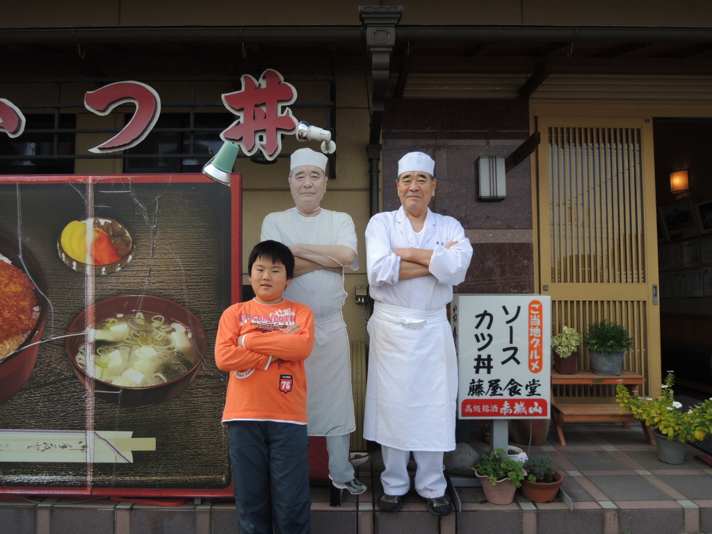 Tomoさんが『お昼のかき入れ時』に店主を外に連れ出して、『笑い』を取るために、看板の脇で息子と同じポーズを獲らせて写真を撮影したって話になっています。