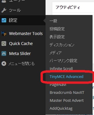 WordPressのダッシュボード画面から『設定』→『TinyMCE Advanced』