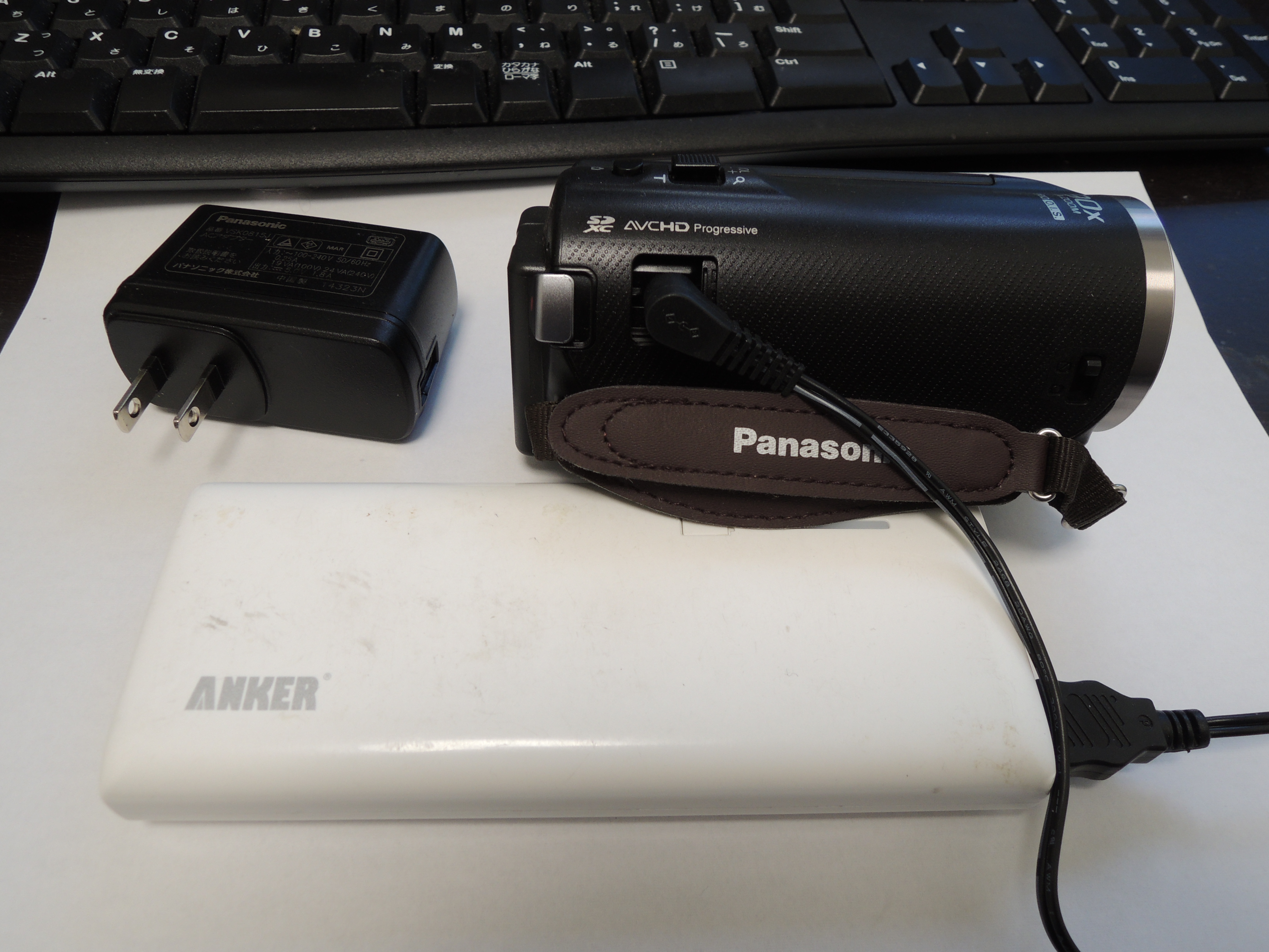 今までですと専用のDCコード(ACアダプタ)っていうのが定番でしたがHC-V360M-Kに関していうとDC-INのコネクタには変化ないのですが、DCコードから一旦USBに変換してUSB→ACアダプタという形になっているので、うっかり充電忘れた時とか、スマホ用に使っている予備のバッテリーで充電出来るっていうのはパナソニックの親切さを感じます。