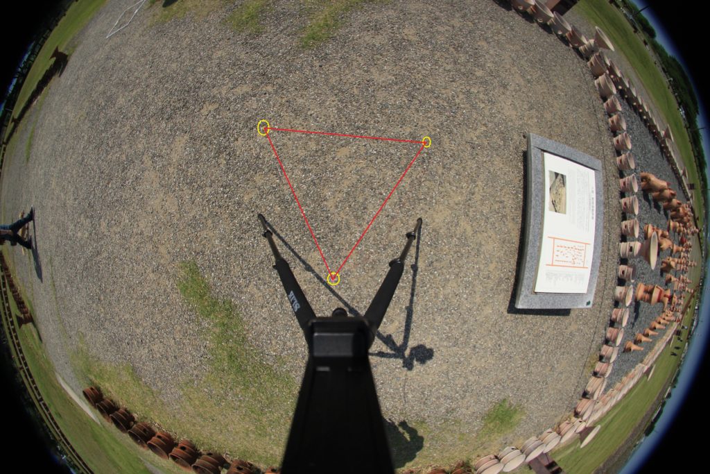 三脚の脚から数センチにところにマーキングします。チェーンリングで構成された三角形を「別撮り」の底面写真と差し替える設定です。